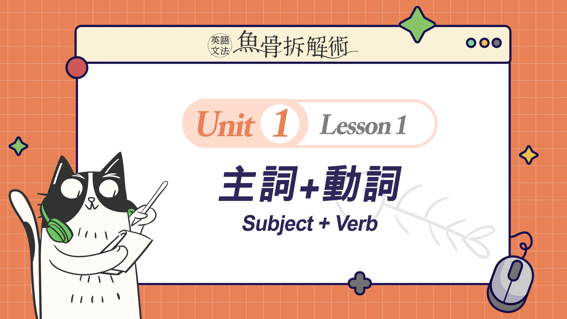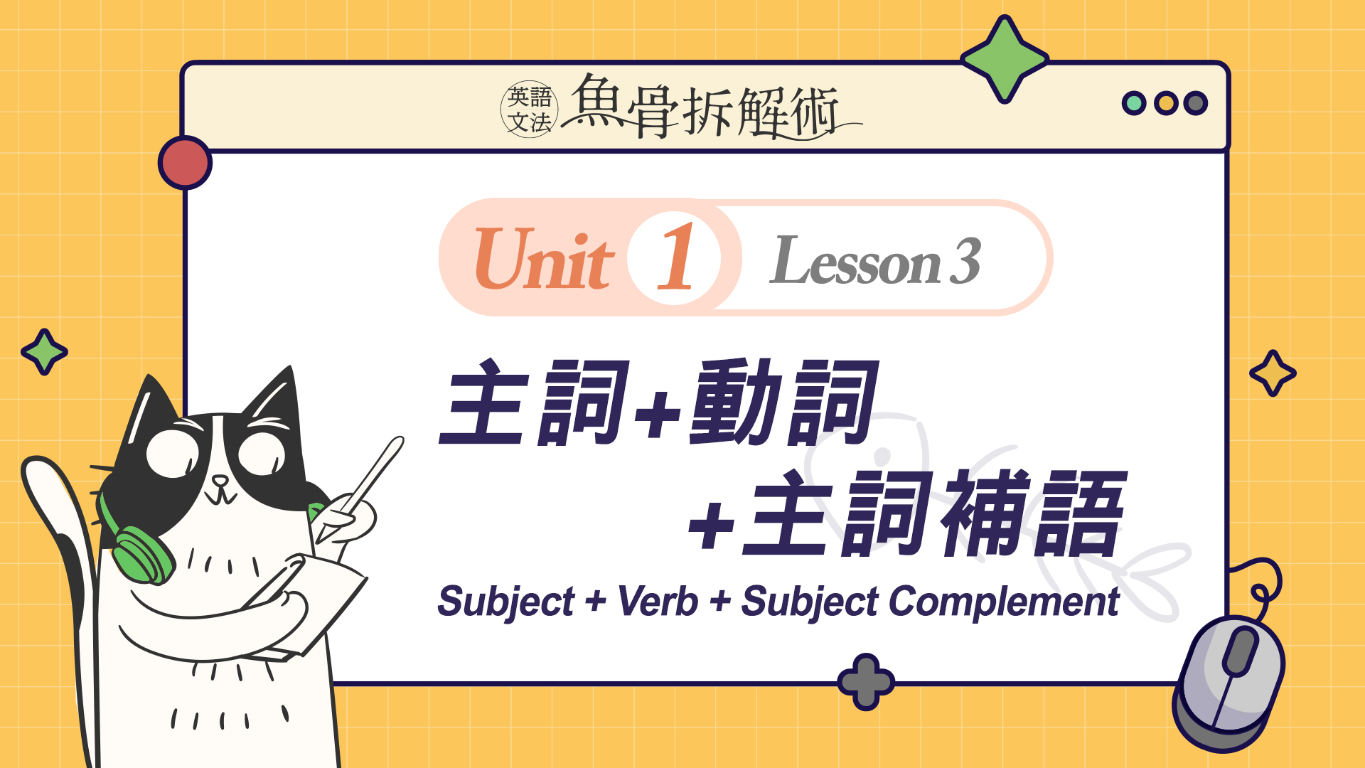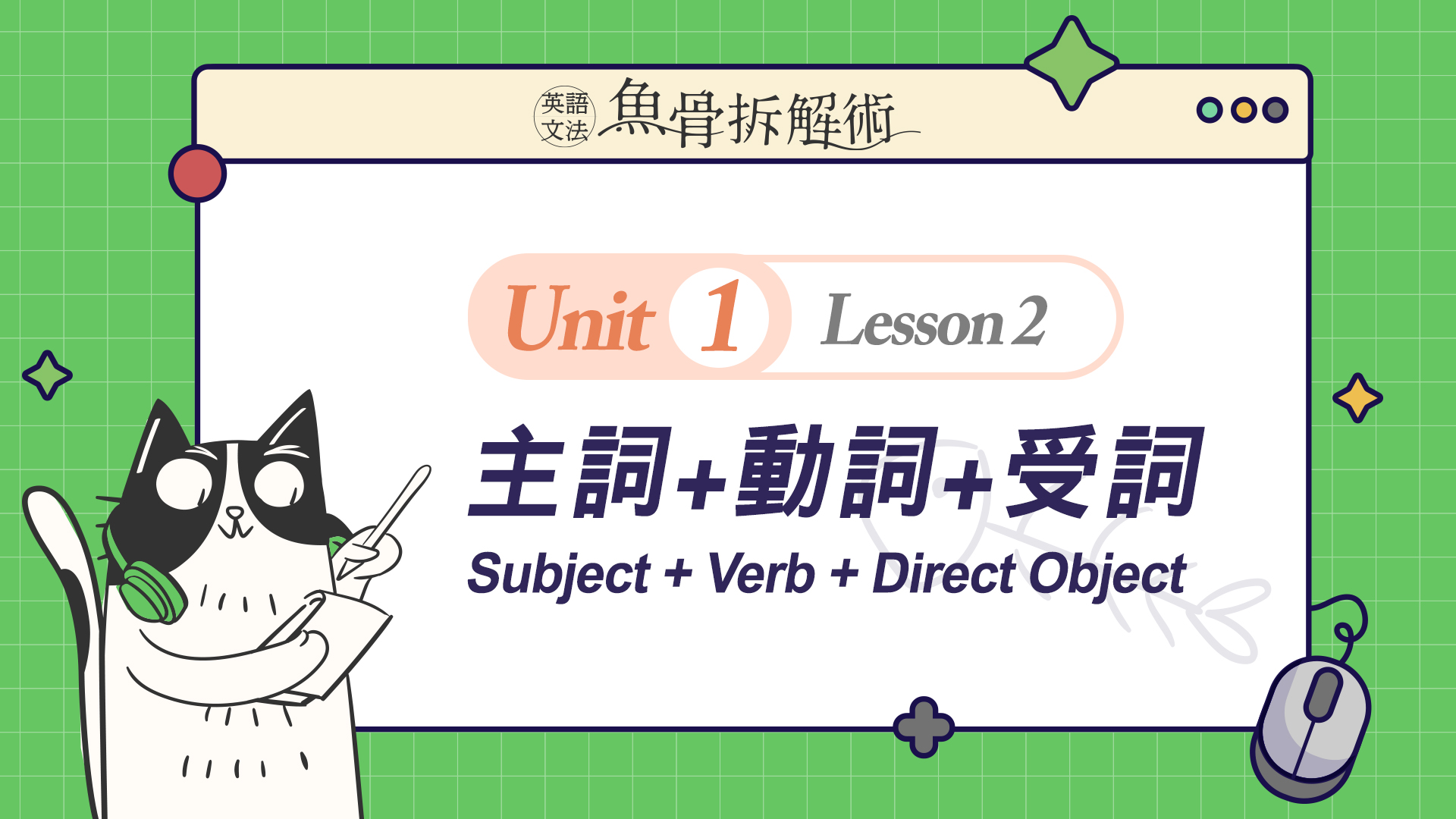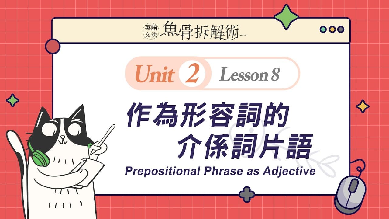 菁英教學團隊將複雜的文法概念從簡到難,切割至合理的吸收量,再搭配充滿趣味性的貓吃魚的情境